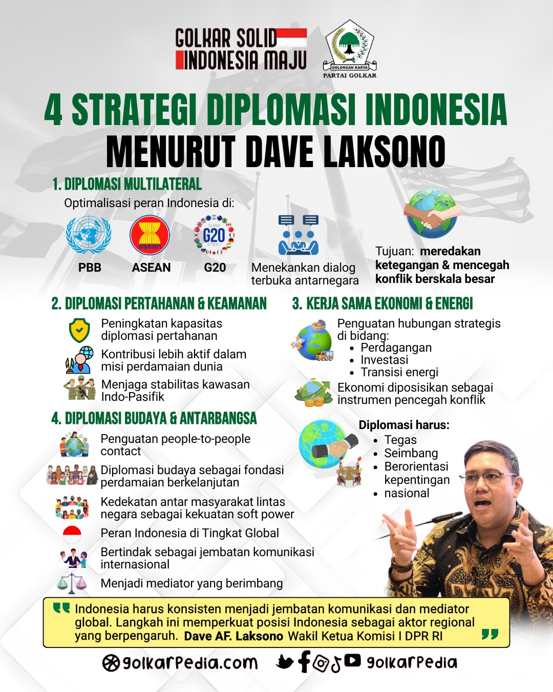 Selain diplomasi politik, Dave juga menyoroti pentingnya penguatan diplomasi pertahanan dan keamanan sebagai instrumen pencegahan konflik. Menurutnya, keterlibatan aktif Indonesia dalam misi-misi perdamaian dunia serta upaya menjaga stabilitas kawasan, khususnya di Indo-Pasifik, menjadi kontribusi nyata yang tidak bisa diabaikan.