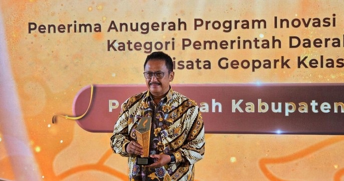 Di atas panggung, Asjap menerima trofi penghargaan Pemerintah Daerah Penggerak Wisata Geopark Kelas Dunia, dikutip dari Detik.
