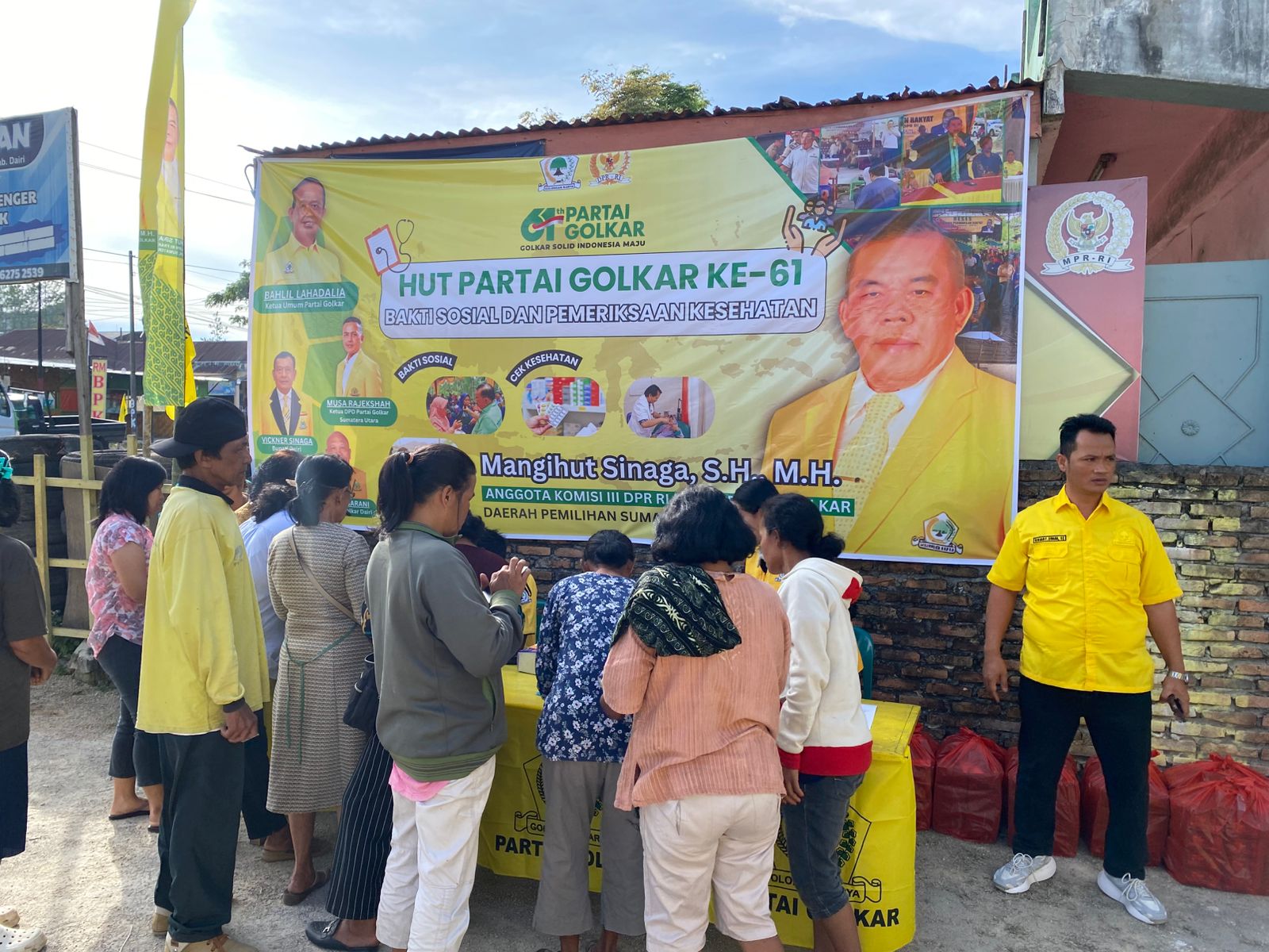Berita GolkarDalam semangat memperingati Hari Ulang Tahun Partai Golkar ke-61, Anggota Komisi III DPR RI Fraksi Partai Golkar, Mangihut Sinaga, S.H., M.H., menggelar kegiatan bakti sosial dan pemeriksaan kesehatan gratis di Rumah Aspirasi Mangihut Sinaga, Sidikalang, Kabupaten Dairi. Kegiatan ini digelar berkolaborasi dengan DPD II Partai Golkar Kabupaten Dairi, sebagai bentuk kepedulian nyata Partai Golkar terhadap masyarakat di daerah pemilihan Sumatera Utara III.