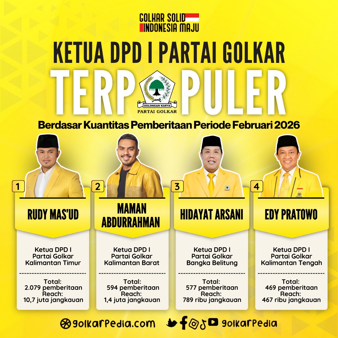 Di posisi empat, ada nama Ketua DPD I Partai Golkar Kalimantan Tengah, Edy Pratowo yang juga menjabat sebagai Wakil Gubernur Kalteng. Ini kali ketiga bagi Edy Pratowo masuk daftar sebagai Ketua DPD I Partai Golkar terpopuler. Selama periode Februari 2026, ia memiliki sebanyak 469 pemberitaan dengan jangkauan mencapai 467 ribu reach.