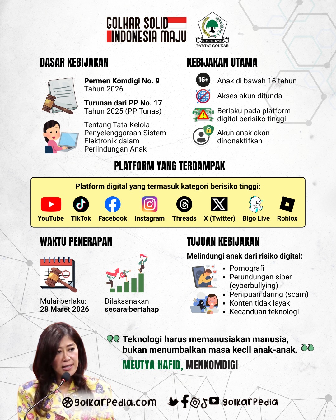 Berita Golkar – Pemerintah resmi mengatur pembatasan akses anak-anak berusia di bawah 16 tahun ke platform digital yang berisiko tinggi. Hal ini diatur Kementerian Komunikasi dan Digital melalui Peraturan Menteri Nomor 9 Tahun 2026.