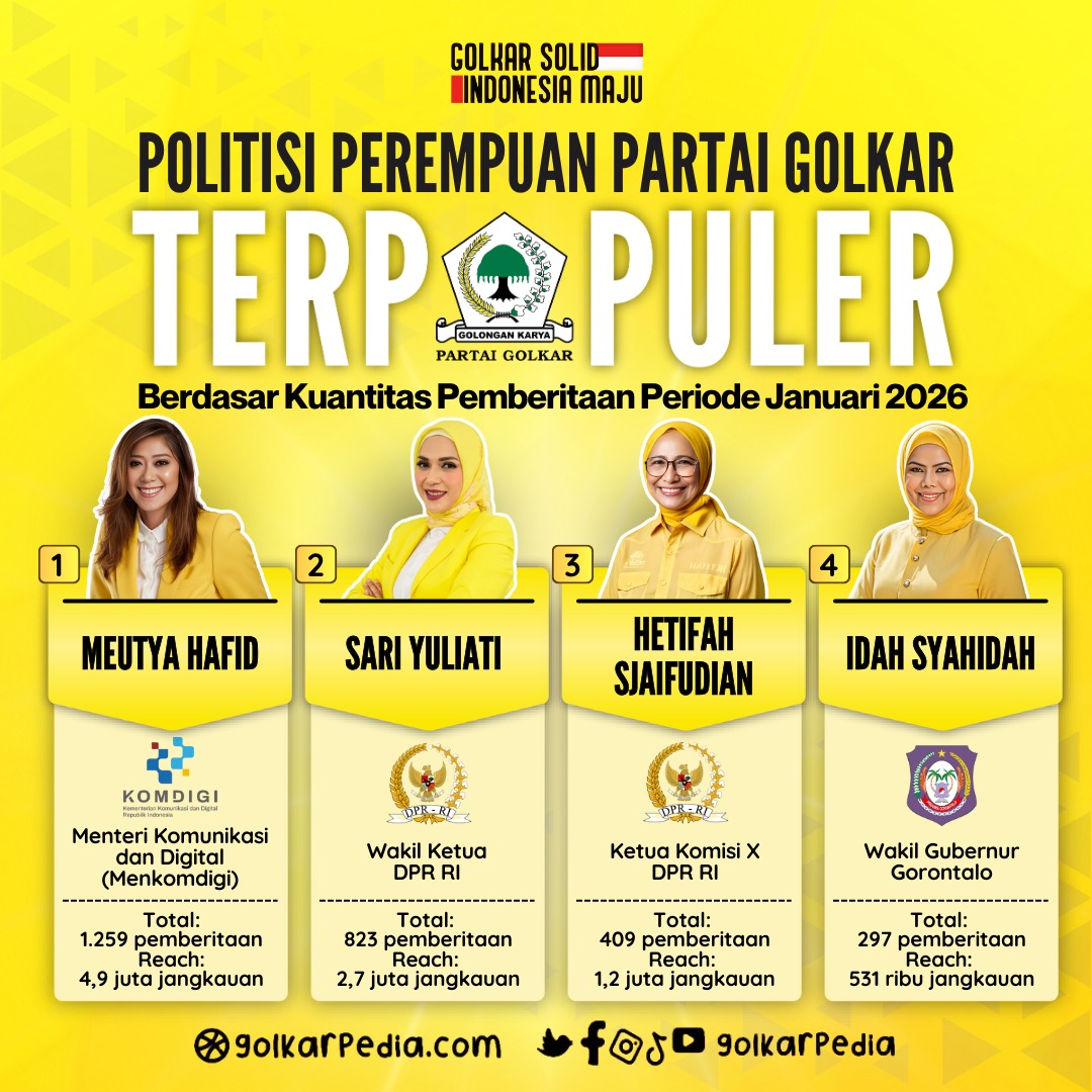 Di urutan pertama, Golkarpedia.com menemukan nama Menkomdigi, Meutya Hafid yang menempati peringkat pertama sebagai politisi perempuan Partai Golkar terpopuler. Pada periode Januari 2026 Meutya Hafid memiliki 1.259 pemberitaan. Jangkauan yang dihasilkan dari pemberitaan sebanyak itu mencapai 4,9 juta reach.