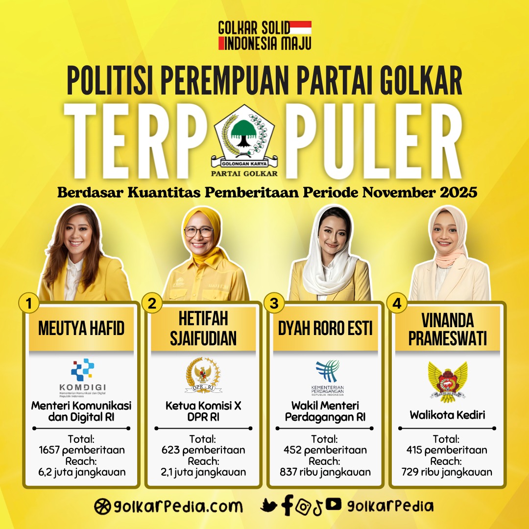 Di urutan pertama, Golkarpedia.com menemukan nama Menkomdigi, Meutya Hafid yang menempati peringkat pertama sebagai politisi perempuan Partai Golkar terpopuler. Pada periode November 2025 Meutya Hafid memiliki 1657 pemberitaan. Jangkauan yang dihasilkan dari pemberitaan sebanyak itu mencapai 6,2 juta reach.