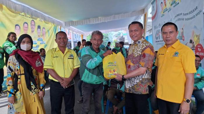 Bambang Patijaya didampingi pengurus DPD Partai Golkar membagikan sejumlah bantuan paket sembako kepada driver ojol.