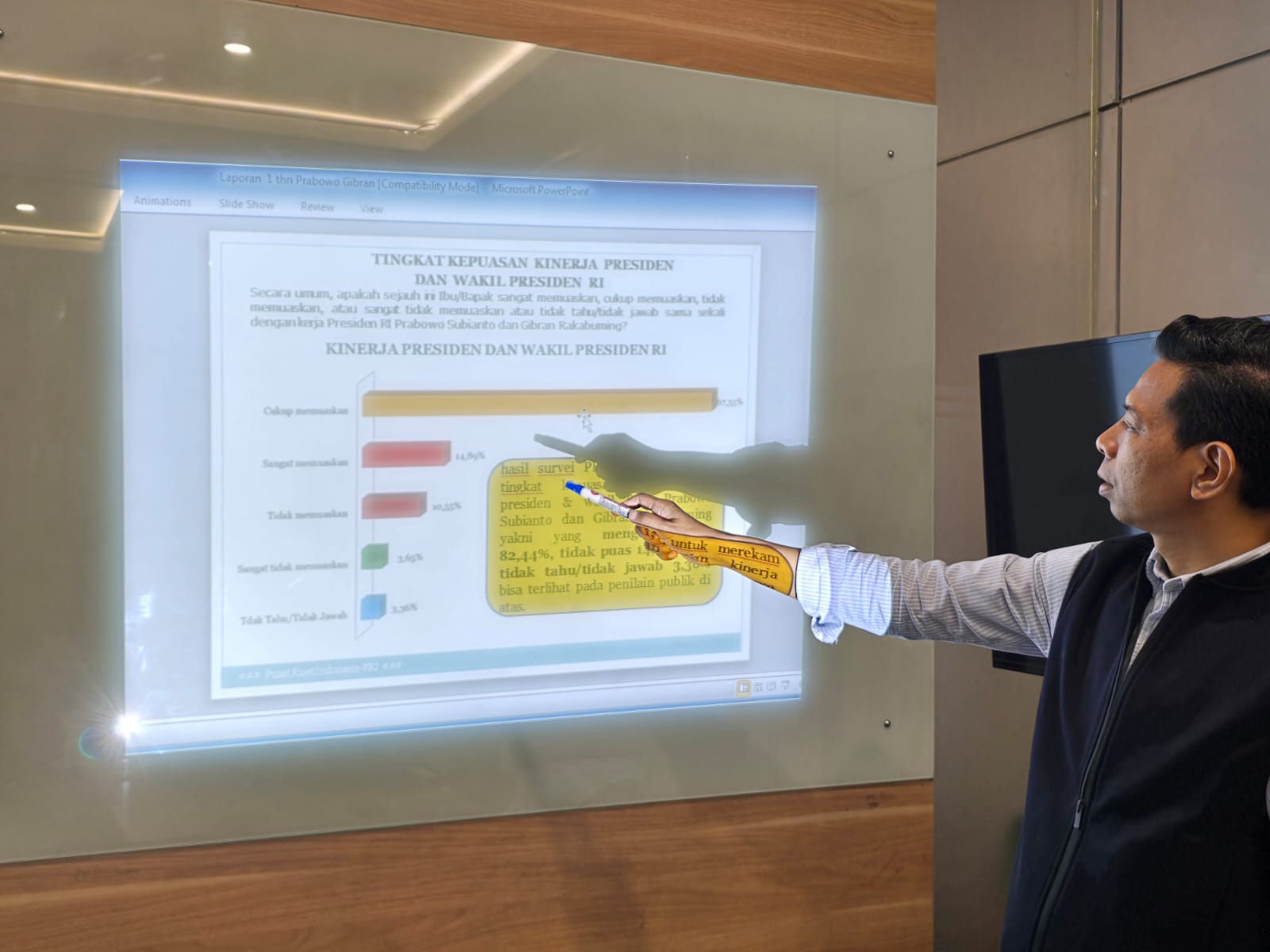 “Dari total responden, sebesar 14,89 persen menyatakan sangat puas dan 67,55 persen cukup puas. Sementara yang merasa tidak puas mencapai 14,20 persen, terdiri dari 10,55 persen yang menilai tidak memuaskan dan 3,65 persen yang menyebut sangat tidak memuaskan. Masih ada sekitar 3,36 persen responden yang belum memberikan pendapat atau tidak tahu,” ujar Deni saat memaparkan hasil survei di Jakarta.